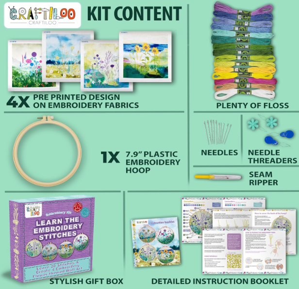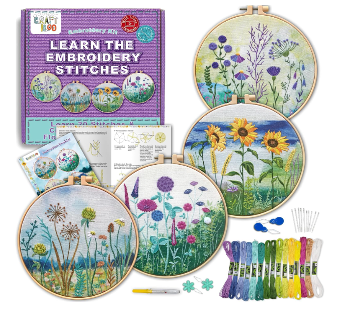 The CRAFTILOO 4-Pack Embroidery Kit includes: 4 pre-printed floral-pattern fabrics, one 7.9″ plastic embroidery hoop, abundant floss, 10 embroidery needles, 2 threaders, a seam ripper, and an 18-page instruction booklet guiding 17 basic stitches. This all-in-one kit is perfect for adults or beginners wanting to explore embroidery in a structured, fun way.