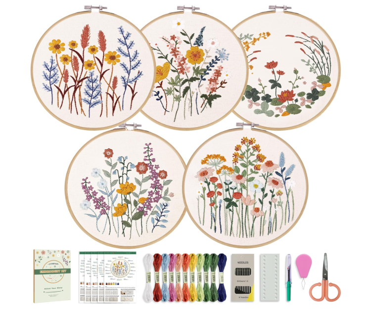 The CYANFOUR 5-Pack Beginner Embroidery Kit for Adults offers five floral pre-printed embroidery patterns, a 7″ adjustable hoop, 19 vibrant threads, 9 needles, a threader, a seam ripper, instructional booklet and online video tutorials. Designed to help complete beginners build confidence while creating beautiful embroidered pieces.