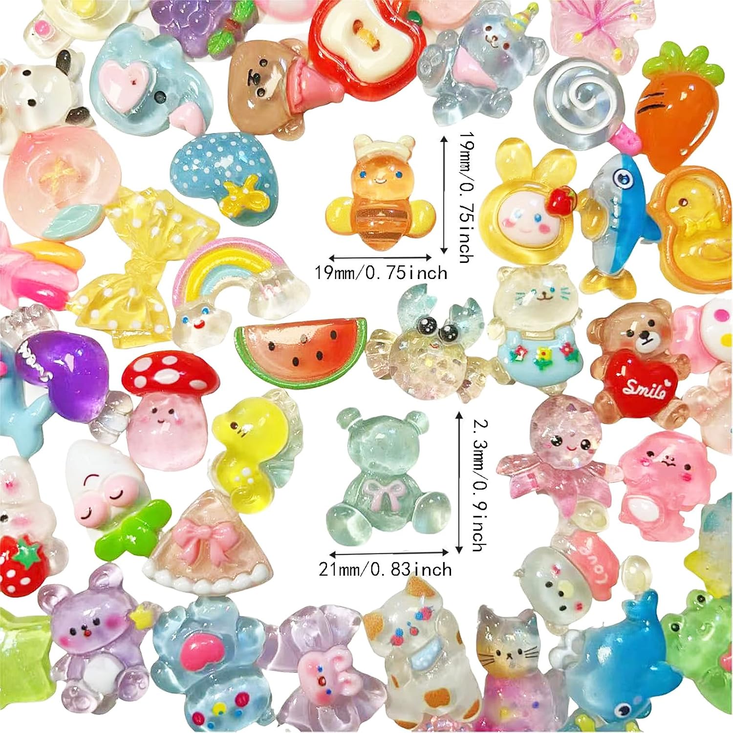 A bulk package of 60 assorted resin charms (flat‑back, no holes for beading) featuring multiple styles (45+ different designs) such as animals, flowers, sweets etc. Each piece is approx 15–30 mm (0.59″–1.18″). Suitable for phone case decoration, scrapbooking, DIY crafts. Glue required for application.