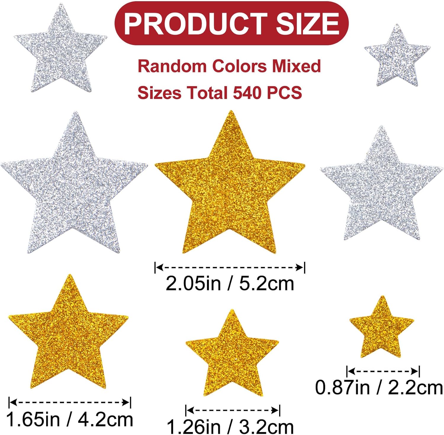 A set of 100 glitter foam star stickers in gold and silver colours, made of EVA foam. Sizes include approximately 2.05″, 1.65″, 1.26″ and 0.87″ (5.2 cm, 4.2 cm, 3.2 cm, 2.2 cm). Designed with self‑adhesive backing for easy application without glue. Ideal for scrapbooking, greeting cards, party decoration, Christmas and DIY craft uses.