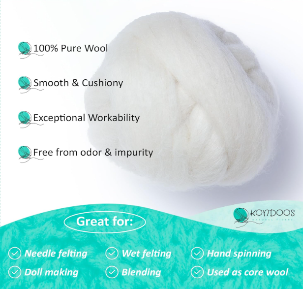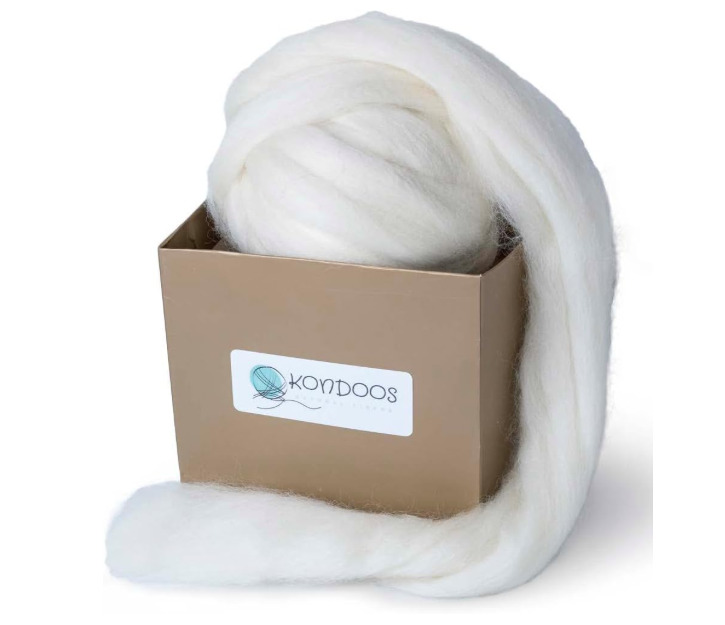 Kondoos Natural Wool Roving (8 ounces, ecru) is a versatile, undyed wool roving suited for needle felting, wet felting, spinning, weaving, doll making, dryer balls and general fibre-arts. The product is sold as a loose roving (not carded batts) that is easy to pull and shape; it works well for both beginners and experienced fibre crafters. Typical item dimensions and weights are provided on the listing (approx. 7 × 5 × 3 in; 8 oz). Use for felted sculptures, embellishments and blended colourwork.