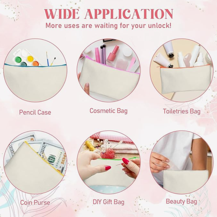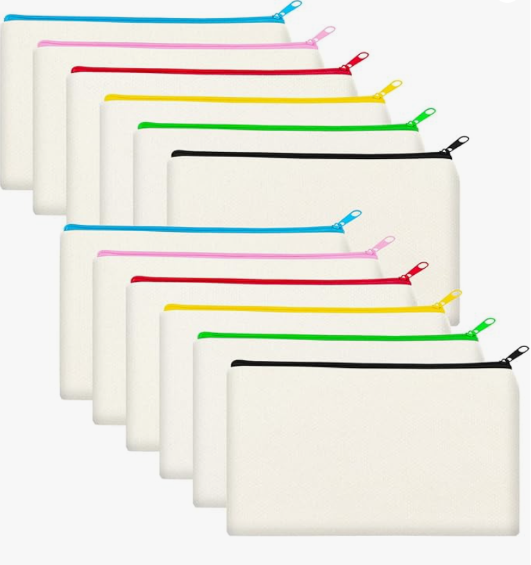 Pack of 12 beige canvas pouches with multi‑colour zippers; usable as pencil bags, makeup pouches, toiletry travel bags.