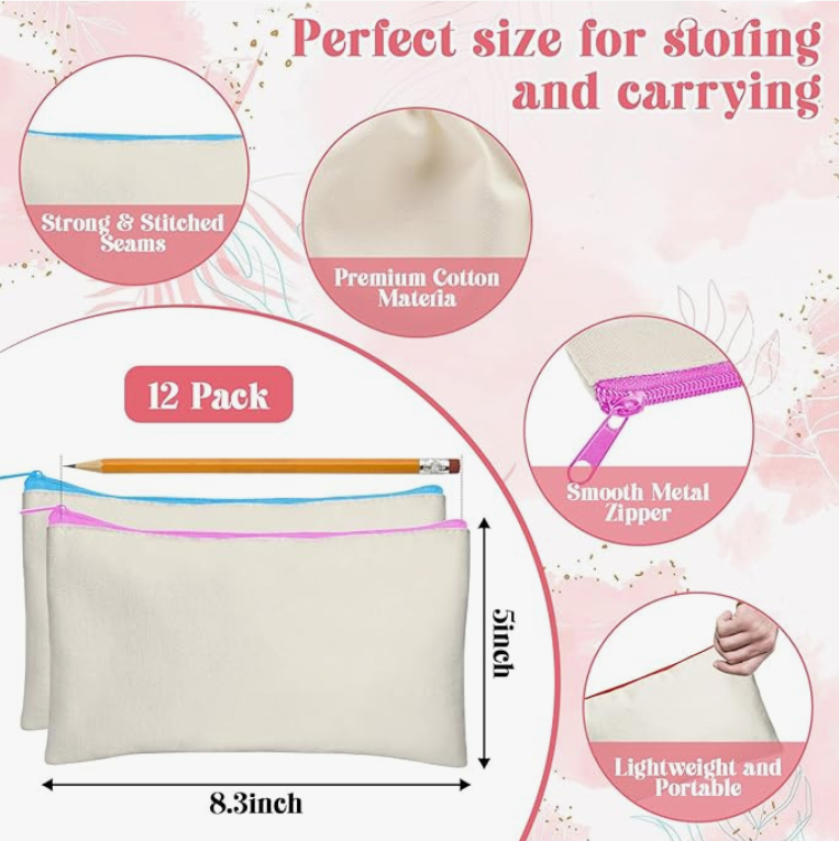 Legigo 12‑Pack Blank Canvas Travel Bags / Multi‑colour Zipper Pencil/Make‑up Case (Beige)