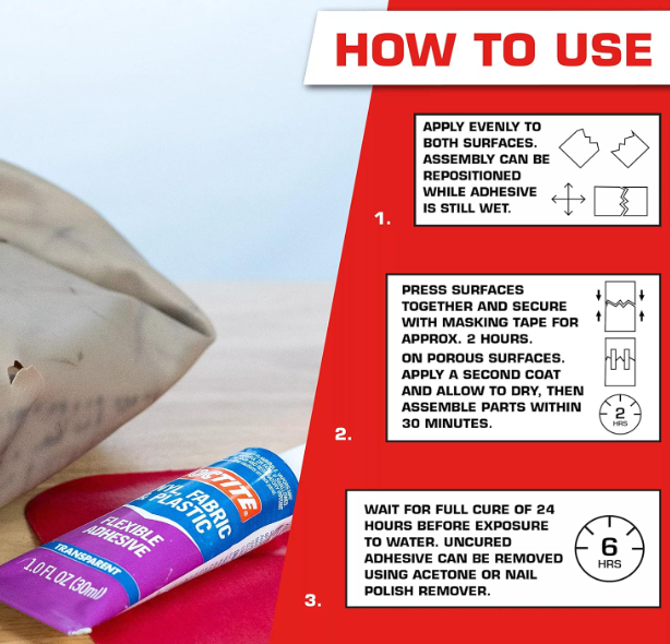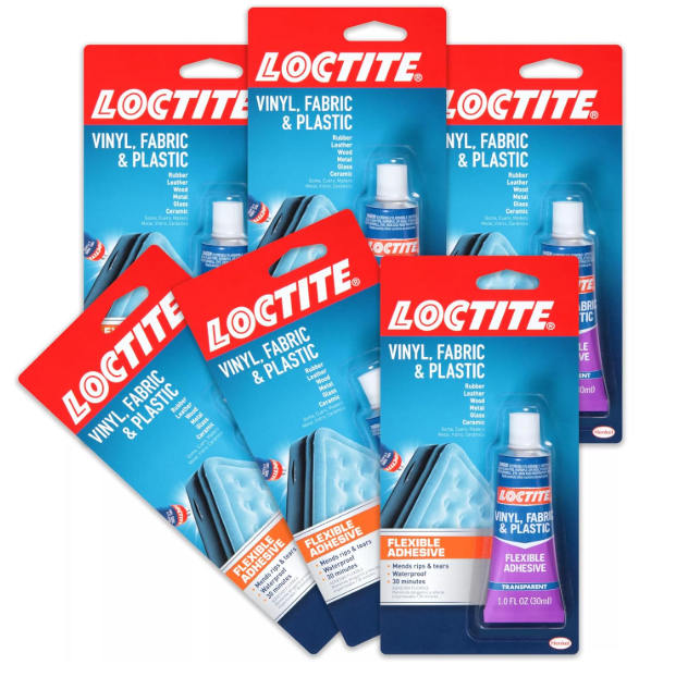 The Loctite Vinyl, Fabric & Plastic Repair Flexible Adhesive is a high-performance one-ounce tube adhesive (pack of six) specially formulated to mend rips, tears and holes in flexible plastics, vinyl upholstery, tarps, outdoor gear, fabric and leather. The adhesive dries clear and transparent, remains flexible under movement, resists yellowing or becoming brittle, and becomes waterproof when fully cured. It sets in around 10 minutes and cures fully in 24 hours, creating a resilient bond suited for indoor and outdoor applications.