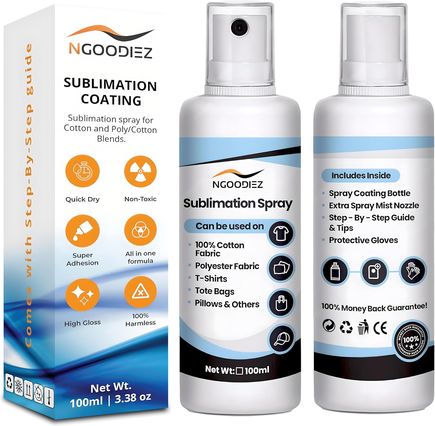 The NGOODIEZ sublimation coating spray makes it possible to apply sublimation transfers on cotton and blended fabrics with vibrant, durable results. The product comes in a 100 mL bottle, features a ready-to-use formula (no mixing), applies easily, and helps prevent cracking, peeling and fading after washing. Item weight approx. 3.53 oz; dimensions ~5.8″ × 1.5″ × 1.5″.