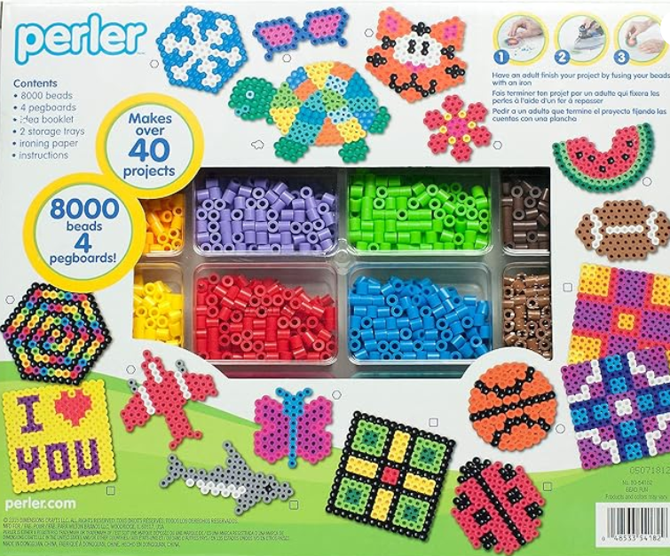 Kick-start a fun creative hobby with this extra-large Perler bead activity kit. It includes 8000 assorted multicolor beads, four pegboards, two storage trays for organization, ironing paper for finishing fused designs, and an idea booklet for inspiration. Designed for children aged 6 and up, this kit promotes artistic expression, fine motor development and crafty fun in a safe, contained format.