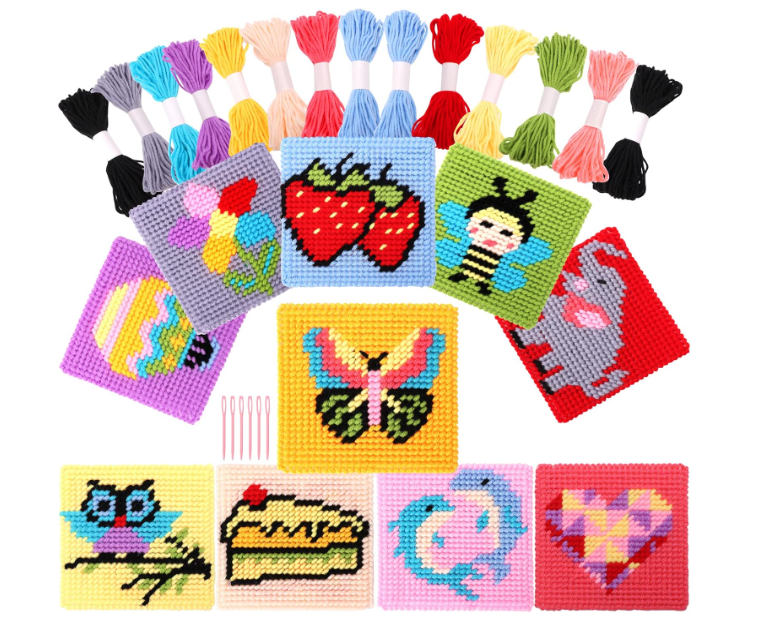 The PLLieay 10-in-1 Kids Cross-Stitch Kit is designed specifically for younger crafters—includes 10 plastic cross-stitch canvases with different fun patterns (animals, unicorns, flowers etc.), 14 coloured threads, 6 weaving needles, an instruction manual and a decorative storage box. Great for kids’ craft time or as a gift.