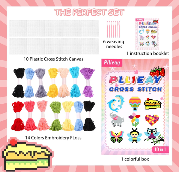 PLLieay 10-in-1 Kids Cross-Stitch Kit – 10 Patterns, Colour Threads, Needles, Storage Box