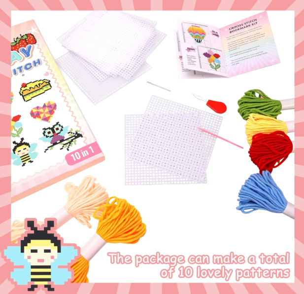 Cross-stitch kit for children with 10 different patterns, color threads, needles and storage box.